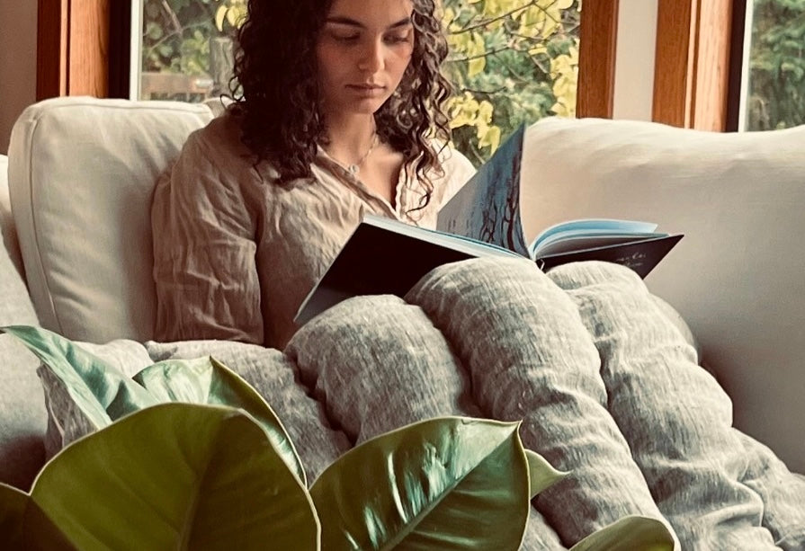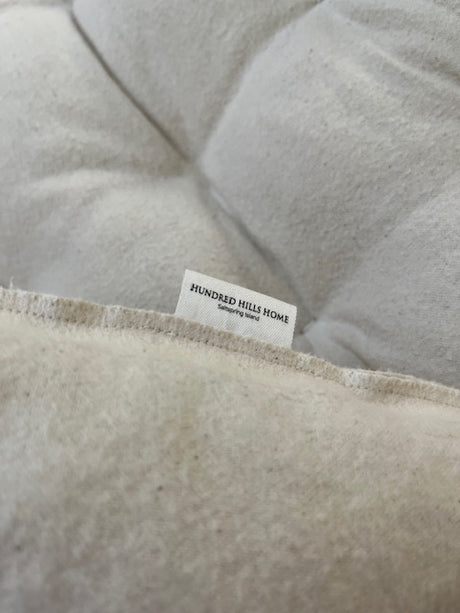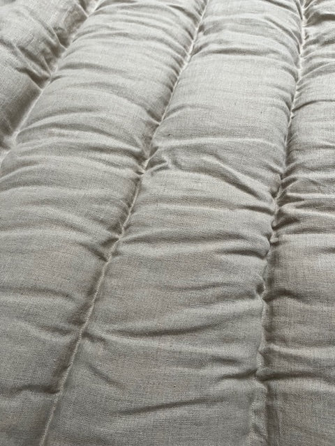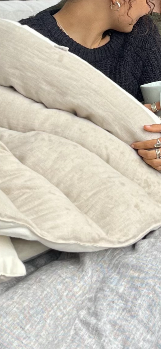 The Snug is filled with our local Saltspring Island Wool and wrapped in Cozy Cotton Flannel with a European Linen on top.